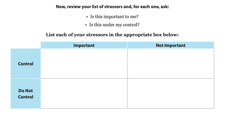 “Take some time to address those stressors that you feel are important and that you do have at least some control over.”