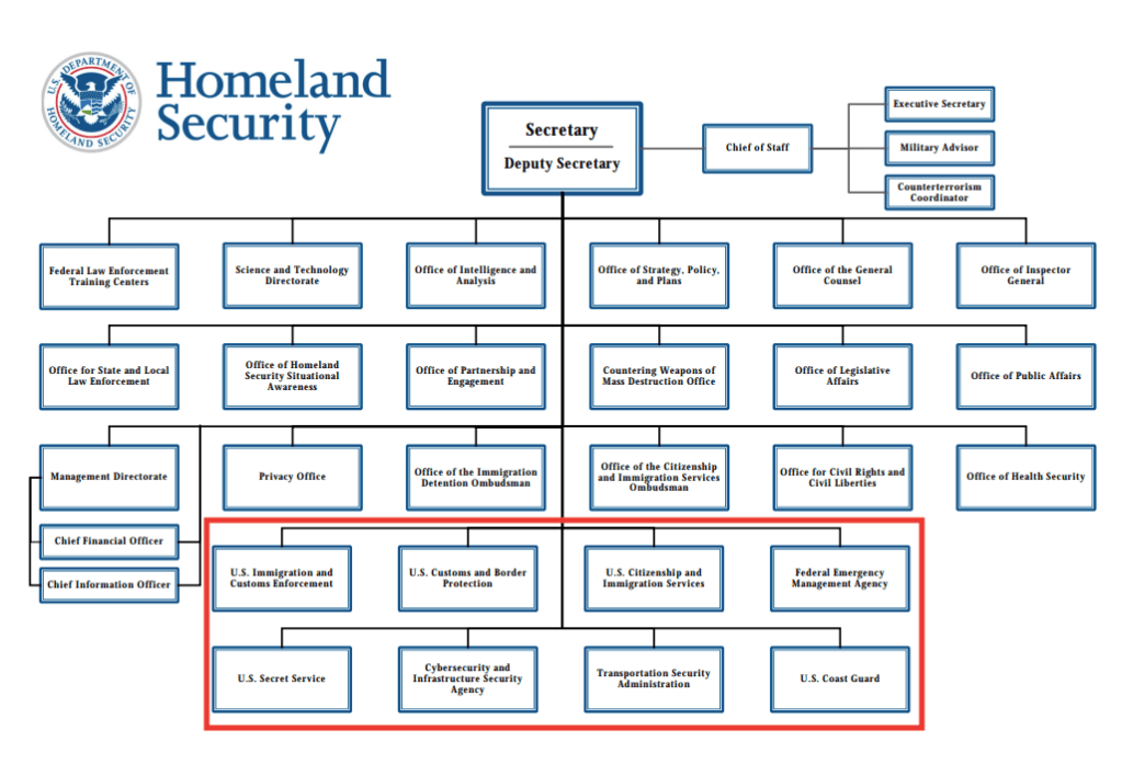 Here is a way-too-detailed diagram of the offices in the DHS. The red box indicates the major operational agencies i.e. the ones you have probably heard of.
