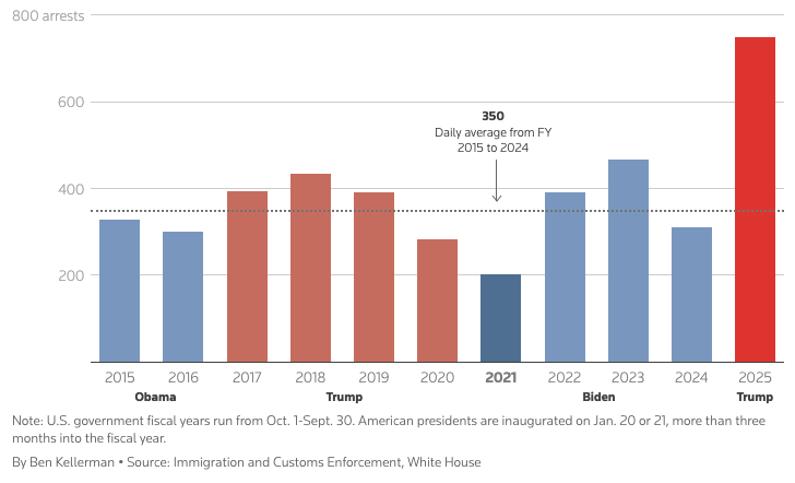 Enter stage left Stephen Miller and Kristin Noem. The former being the White House Deputy Chief of Staff and the latter the DHS Secretary. These are ICE’s bosses. They issued a mandate that ICE agents arrest 3,000 undocumented immigrants per day in accordance with the current administration’s goals for immigration reform, a notoriously ambitious quota. Here’s a visual from Reuters.